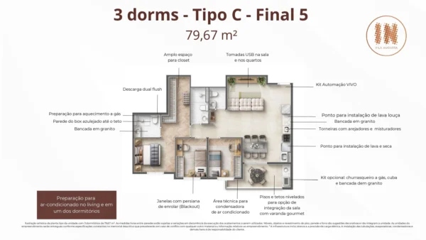 79,67 m² – 15 apenas de 3 quartos com suíte e terraço, vaga,